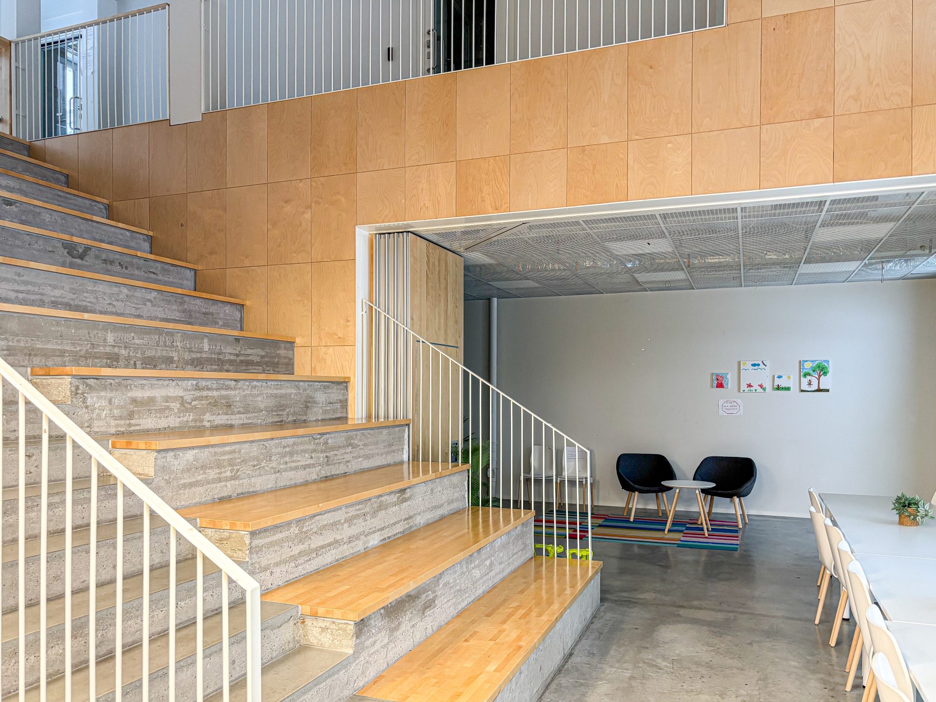 Residents have access to bright and versatile common facilities on the 1st and 2nd floors of the building. The space can be divided with a movable wall. An auditorium staircase connects the 1st and 2nd-floor areas.