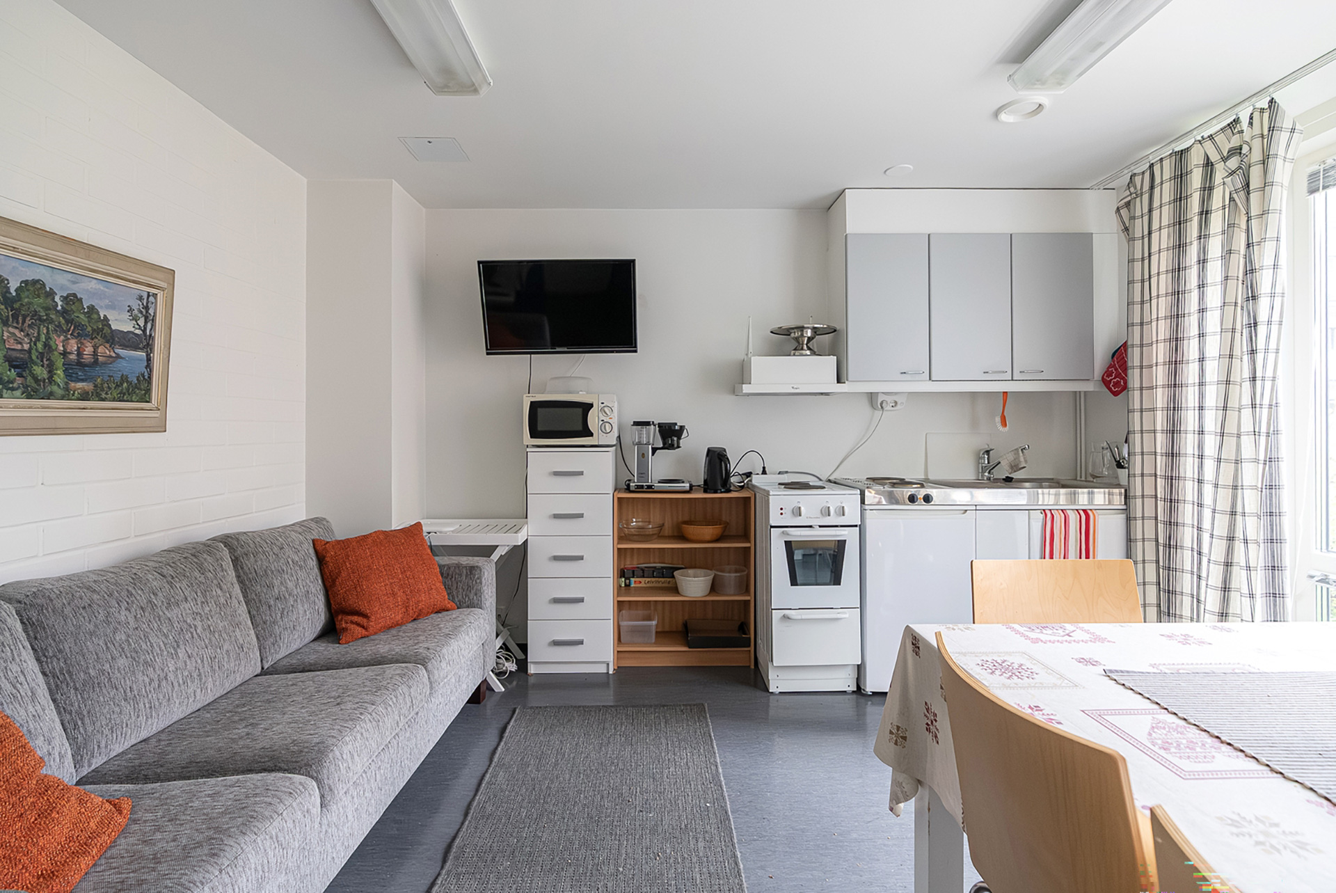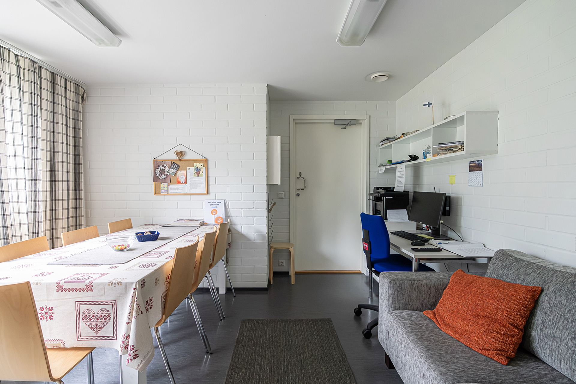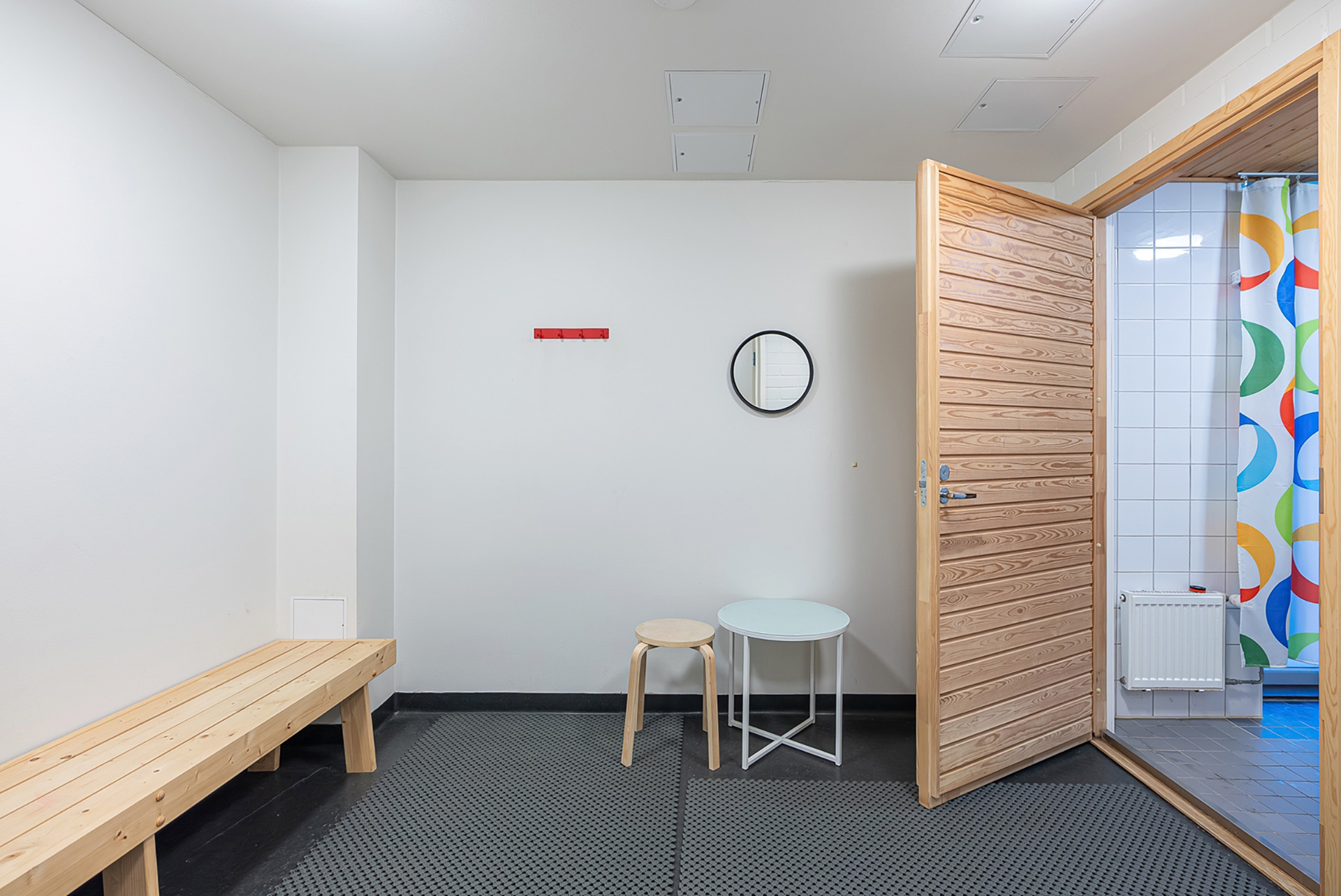 The house has a common outdoor equipment storage in the courtyard building, a sauna, a laundry room and community space break room. The free house laundry has washing and drying machines.