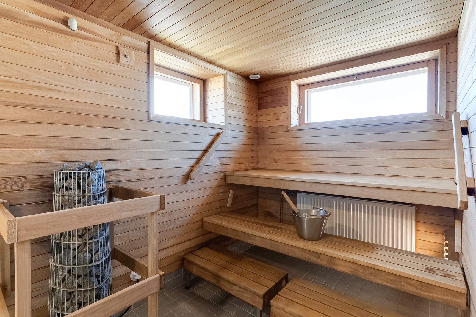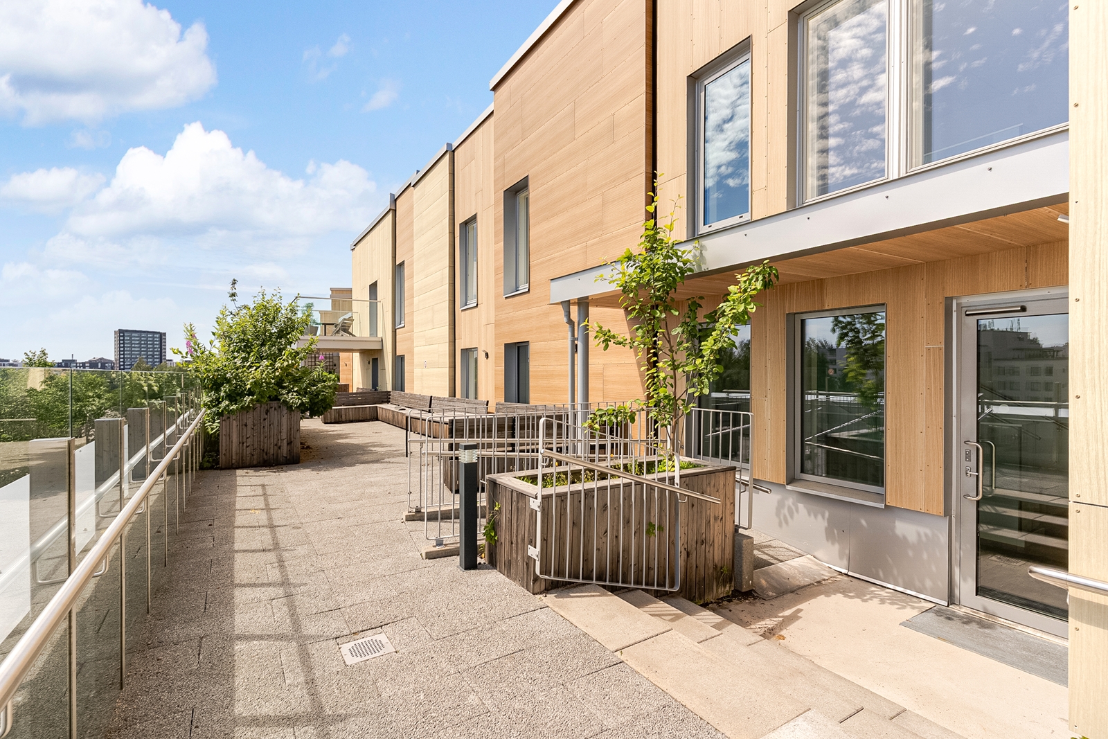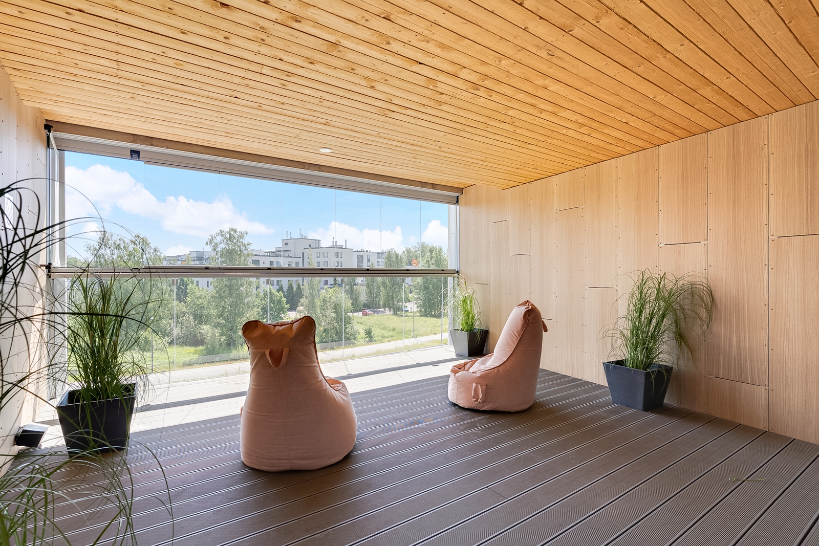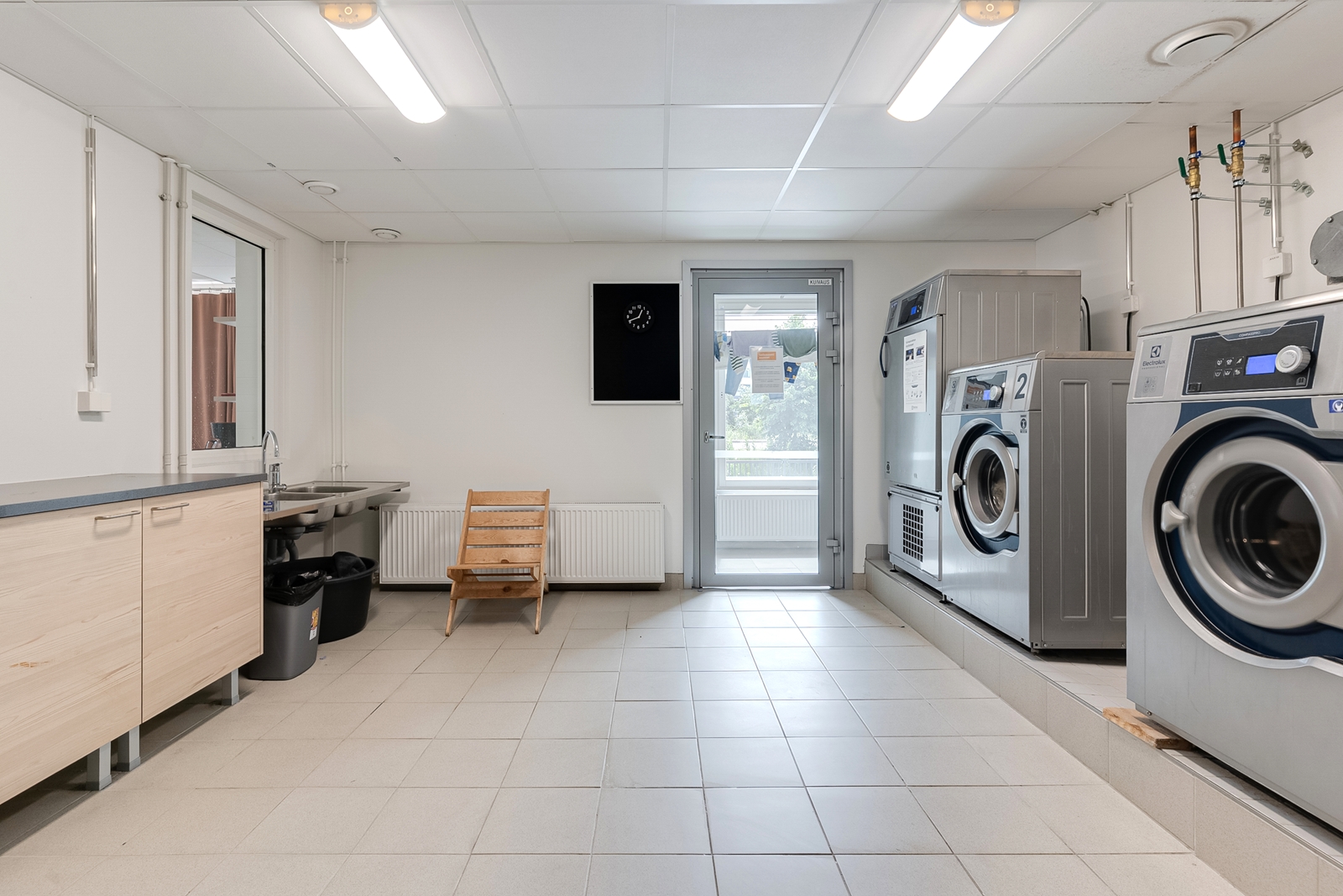Use of the laundry and drying room is included in the rent. Shared balconies are located on floors 3 and 4. There is a shared roof garden on floor 5 and two saunas with cooling balconies on floor 6.